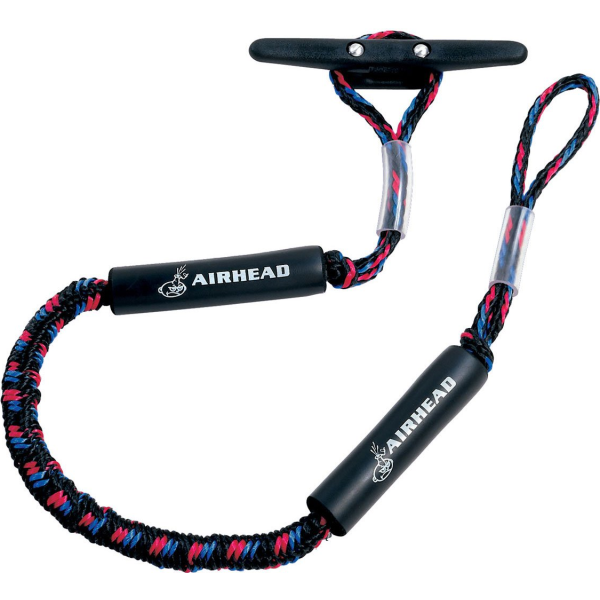 AIRHEAD Bungee Dock Lines absorb shock to boats, cleats, docks, pylons and other hardware. The bungee cord is hidden inside the rope and acts as a built-in snubber. Two foam floats protect the boat from chafing. There's a sliding adjustment at both ends for quick docking. Recommended for docking boats and PWC's up to 3,500 pounds. Tensile strength is 2,150 pounds. Black/Blue/Red color scheme. AHDL-4: 4ft., stretches to 5 1/2 ft.