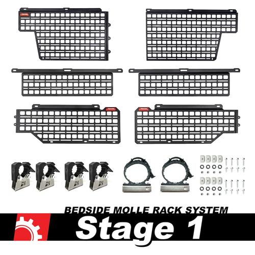 Universal Fit Product. AttributesMounting Type: Bed Side MountMaterial: Steel Dimensions: Direct-Fit Finish: Textured Powder Coated Color: Black With Mounting Hardware: Yes Product DescriptionJust because you have a lot of gear, doesn’t mean you have to have a lot of mess. While standard storage might not cut it, the BuiltRight Industries Bedside Rack System can. Using the same factory mounting points, the rack system installs to keep your gear organized, easily accessible and secure. They work with all MOLLE/PALS accessories in addition to universal slots for all kinds of storage possibilities. The BuiltRight Modular Bedside Rack System installs using these same factory mounting points, without the need for modification to the vehicle and leaves the utility rail completely unobstructed and available for use. The panels provide MOLLE-compatible features for the use of MOLLE/PALS accessories in addition to universal slots for an infinite number of possibilities. The growing selection of custom attachments offered by BuiltRight will help you secure a wide variety of gear, but these slotted features will also allow you to bolt just about anything to these panels.Features & Benefits |