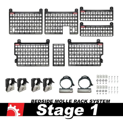 Universal Fit Product. AttributesMounting Type: Bed Side MountMaterial: Steel Dimensions: Direct-Fit Finish: Textured Powder Coated Color: Black With Mounting Hardware: Yes Product DescriptionJust because you have a lot of gear, doesn’t mean you have to have a lot of mess. While standard storage might not cut it, the BuiltRight Industries Bedside Rack System can. Using the same factory mounting points, the rack system installs to keep your gear organized, easily accessible and secure. They work with all MOLLE/PALS accessories in addition to universal slots for all kinds of storage possibilities. Product development began with a 3D scan of the Gladiator bed and moved quickly into the first of six prototype kits. We use a combination of experience (military weapon system design, vehicle component engineering), computer aided analysis (known as FEA) and mostly importantly, good old fashioned test miles to revise and refine the design. In the pursuit of the best possible solution, we set no deadlines and aren’t afraid to make dramatic design changes and it shows in the finished product. Each panel is manufactured using cutting edge CNC equipment and high-quality domestic materials. A sheet of 1/8 Inch steel plate is fed into a combination turret punch and laser. The turret punch uses custom tooling to punch burr-free rectangular and slotted features into the panel before the laser cuts the more complex profiles. You’ll notice that out panels feature no 90 Degree corners or sharp angles. This is to allow the panel to transfer load into the bedside while minimizing stress concentrations. The combination of manufacturing processes is a perfect fit for this design. Finally, each panel is CNC formed and inspected before heading out for a durable black texture powder coat.Features & Benefits |