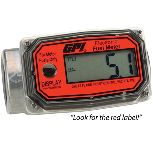 Universal Fit Product. Product DescriptionThe GPI 01A31GM digital turbine flowmeter is made from durable cast aluminum and features an LCD display that is accurate to +/-5 percent of reading. This economical turbine meter is designed for flow rates from 3 to 30 GPM and is factory calibrated in gallons for use with diesel, gasoline or kerosene. The lightweight 01A31GM mounts easily to the end of a hose and is ideal for use with free flow gravity systems or combined with an electric transfer pump as part of a fuel transfer system. The GPI 01A31GM digital flow meter comes with two 0.75 Inchreducers to work with either 1 Inchor 0.75 Inchline sizes, 0.75 InchMNPT pipe nipple and two standard AAA batteries. Features & BenefitsAttributesCompatibility: M-3025/ M-3425 Heavy Duty 12 And 24 Volt DC Fuel PumpsType: Digital Range: 3 To 30 Gallons Per Minute Face Color: Orange Lighting: Illuminated Universality: Fully Universal |