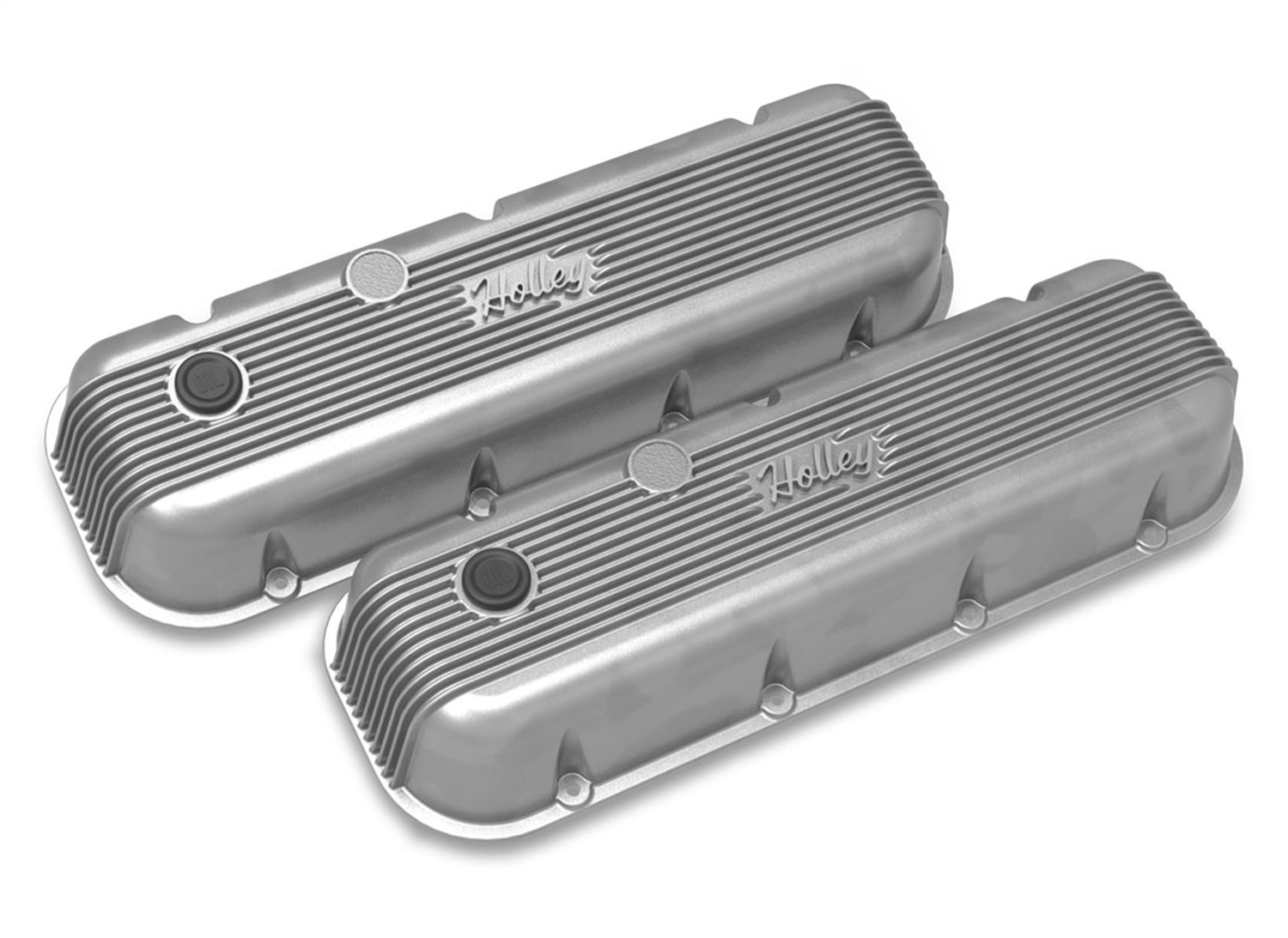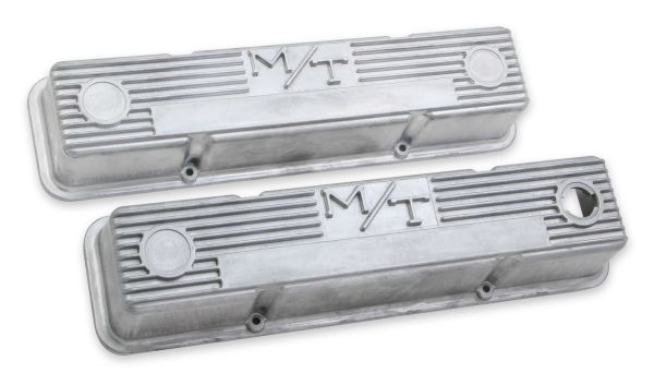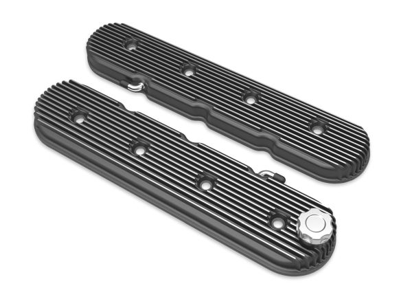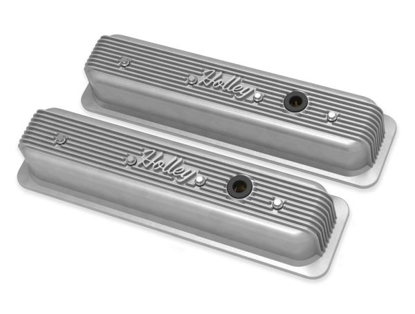 Holley's Vintage Series Big Block Chevy valve covers are the latest expansion to the Vintage Series family of aluminum dress up products featuring a classically inspired finned design and a retro-style Holley script brandmark. The new, highly anticipated Big Block Chevy version is manufactured from die-cast aluminum and includes cast-in oil drippers and emissions provisions punch-outs for your custom application. These valve covers were designed as a standard height BBC cover, therefore internal clearances are only enough for stock or stock-replacement valve train. Includes vintage inspired push-in rubber oil fill plugs, a PCV grommet, and baffle plates with their required mounting screws. The BBC Vintage Series valve covers are available in five unique finishes: natural cast, polished, satin black machined, Holley red machined, and factory orange machined - and a color matched Vintage Series finned air cleaner assembly is currently offered in most finishes.