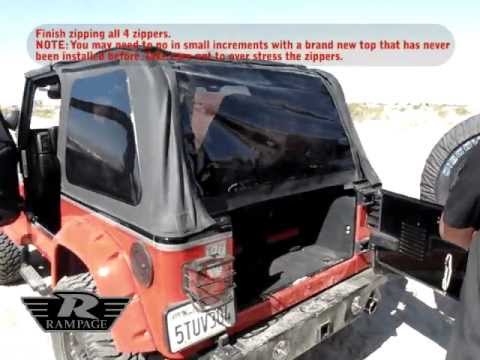 The Rampage Frameless Trail Top installs over the original equipment factory roll bar for a snug fit. This unique design allows for larger side windows and improved visibility with removable side and rear windows that quickly convert the soft top into an open Safari top. Windows use heavy duty molded tooth zippers and are easily replaced or removed. The windows are also stored in a special separation panel between the ceiling and roof top which is concealed to protect the windows from scratches or puncture. The fastback style offers improved aerodynamics and a quieter ride than factory bow style tops. The windshield channel, tailgate bar, tub rail kit and windshield upright inserts are required to attach this top and can be purchased separately. The door surrounds and door skins are included. For half door applications only.