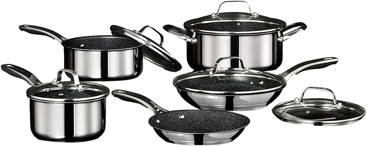 Universal Fit Product. Product DescriptionStarfrit "The Rock" Stainless Steel 10 Piece Set Includes 1.9qt and 3 qt sauce pans, 5 Qt StockPot, 8" and 10" fry pans, all with lids Features an induction ready exterior and an extra thick bi-clad base for even heat distribution. Rock.Tec surface enhancement is a unique manufacturing process that buses small metal pellet impact technology to modify the surface to form an ultra durable rock-like finish. The result is an outstanding release performance, 3 times better than traditional non-stick cookware. Three times more durable than conventional non-stick, and resists scratch and abrasion. Compatible with gas, electric, ceramic and halogen stovetops Three-year warranty |