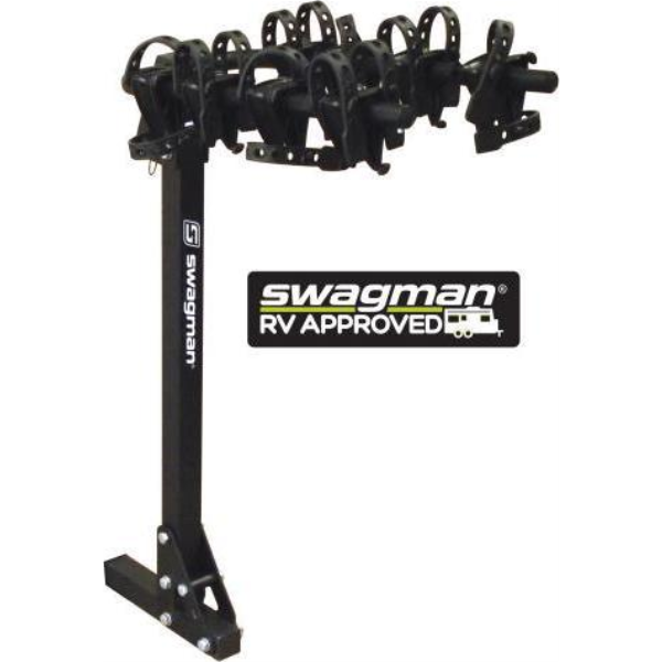 Discover the Swagman TRAILHEAD RV, a specially designed hitch mount hanging bike rack tailored for RV enthusiasts. Engineered to carry up to four bikes on the back of an RV, this rack is RV Approved, ensuring it can withstand the extra force associated with travel trailers or 5th wheel RVs.