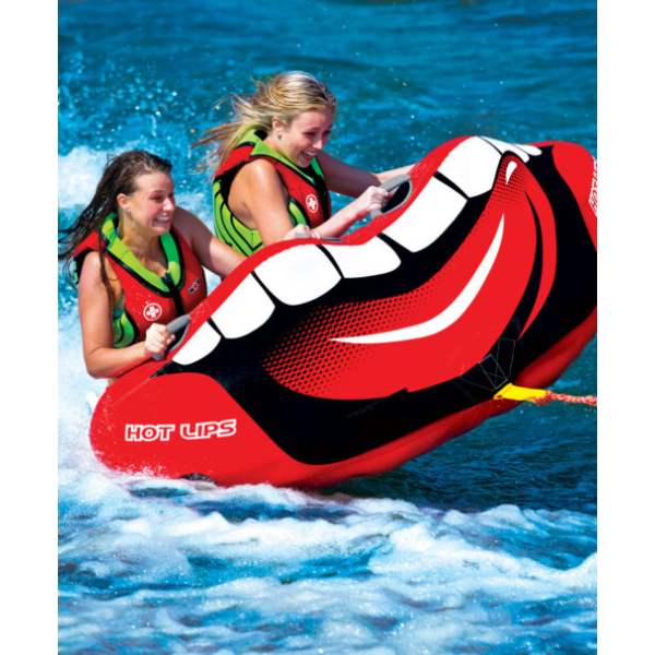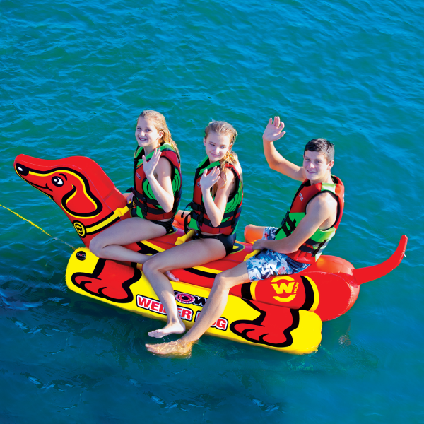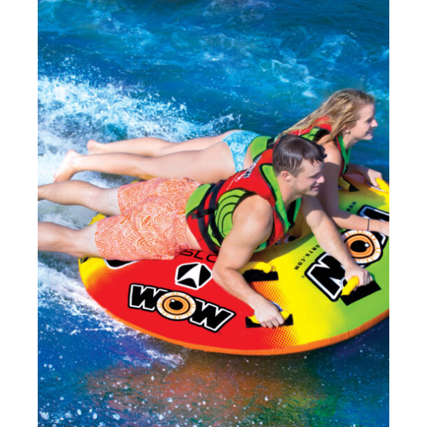 The Jet Boat series from WOW is a serious upgrade on an old design. The torpedo or hot dog in-line towable has been around for years but the problem with these items has always been that they couldn't get outside the wake very easy and on the turns they would tip over because of their high center of gravity. WOW has fixed these problems with their new patent-pending Flex-Form seating system. Flex-Form seating allows the riders to sit down inside of the tube instead of on top. This lowers the center of gravity of the item and keeps it fast and upright on the whips and turns. This added stability is great for those that want to go fast but also for those that want a safer, less eventful ride. The Flex-Form seating is constructed of a nylon harness to keep the rider's bottoms from hitting the water as well as a layer of 4-way stretch, UV resistant material for added comfort.; 1-2 rider Secure Form-Fit Cockpit tube; 154kg, 340 pounds, maximum capacity; Reinforced front tow point with Molded EZ tow connector for EZ rope hook-up; Lowered center of gravity keeps the towable upright on whips and turns; SECURE FORM-FIT COCKPIT SEATING provides comfort and stability of whips and turns; SECURE FORM-FIT COCKPIT SEATING built with UV resistant 40-way stretch material for an ultra comfortable ride.; The FORM-FIT cockpit is built with an internal harness to prevent rider's bottoms from hitting the water.; Great family fun towable for young kids and adults who want to sit inside a cockpit for a more secure ride; HI-VIS color brand edition keeps the tube and riders highly visible on the water; 4 double webbing foam handles and 2 flat webbing handles; Full nylon cover with heavy duty secure zipper; Heavy-duty PVC bladders; Zippered valve cover; Speed valve for fast inflation and deflation; Deflated Size: 100 in x 42 in or 254 cm x 107 cm; Inflated Size: 98 in x 38 in x 16 in or 249 cm x 97 cm x 41 cm; Backed by 1 year warranty