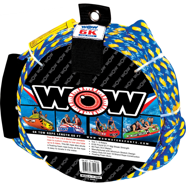 This 6K towable rope is custom made to tow any tube up to 6 riders. This 6K rope also struts a floating foam rope buoy so rope is easy to locate in the water.; 6100 Pound (2.77 Mg) break strength; Manufactured with minimum stretch design; Heavy-Duty 3/4 Inch 16 strand rope construction; Floating foam buoy